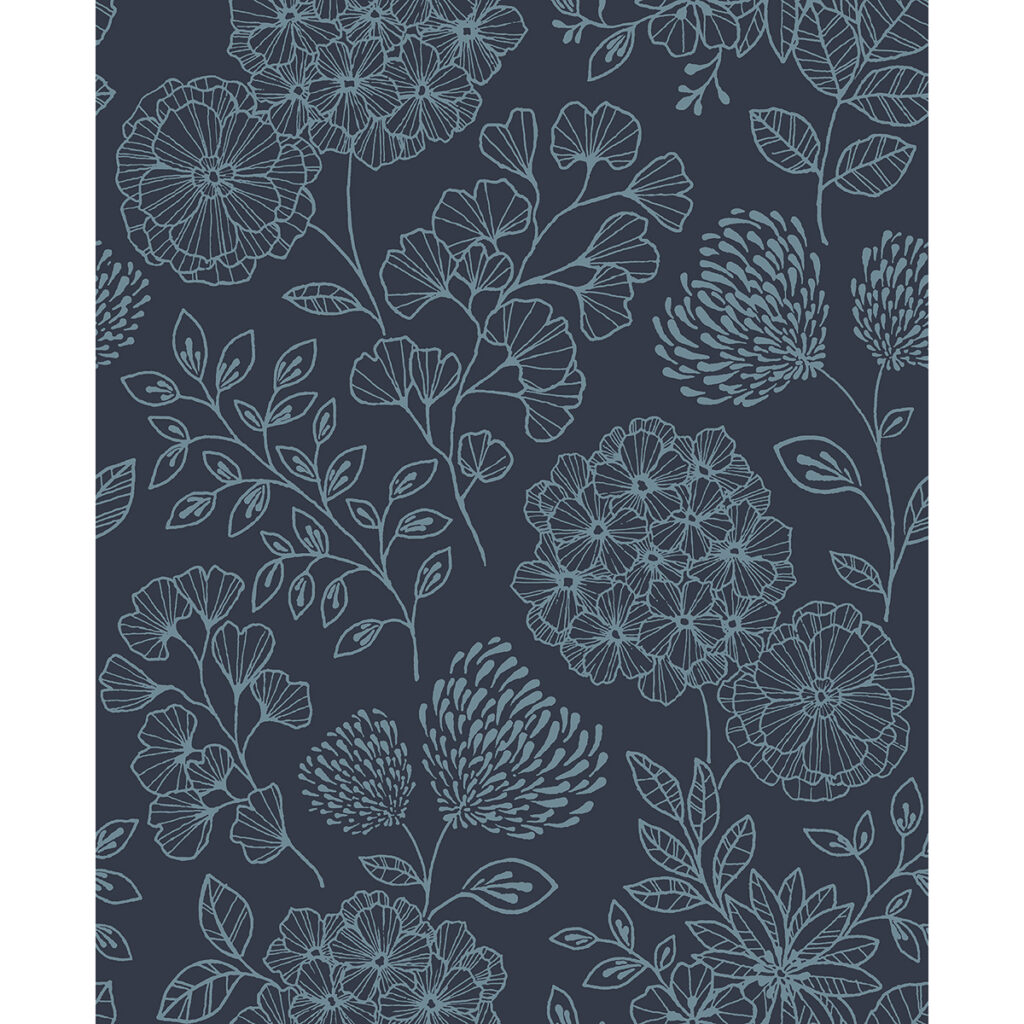 Delicate floral details and rich color bring modern charm to your home. The crisp linework against the deep blue backdrop creates a simple elegance. Ada is an unpasted, non woven wallpaper.