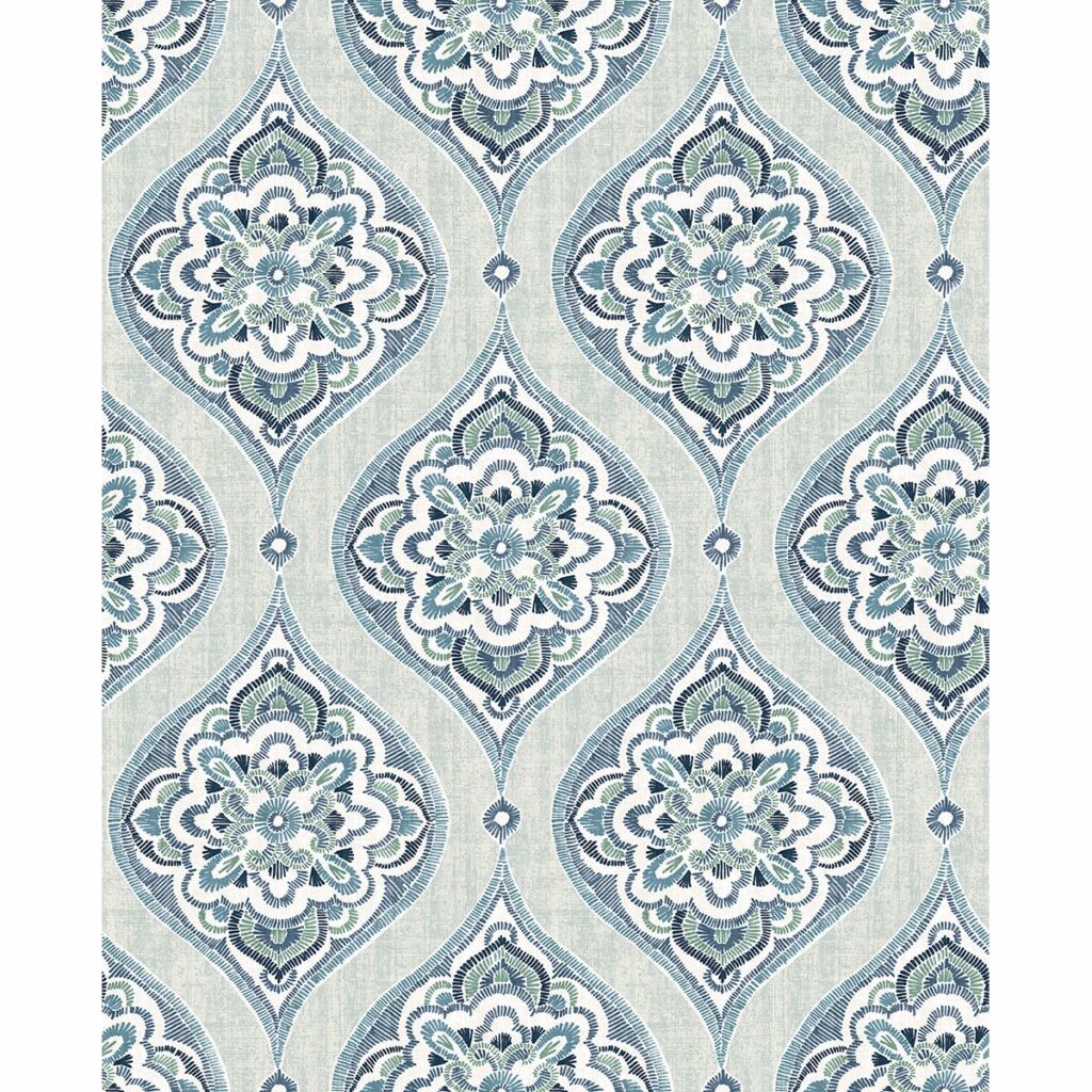 Bright and beautiful, this Scandinavian inspired print has a mixture of modern and classic elements. The design features hand drawn aqua, seafoam and navy damasks with an energetic, cool toned palette. Adele is an unpasted, non woven wallpaper.