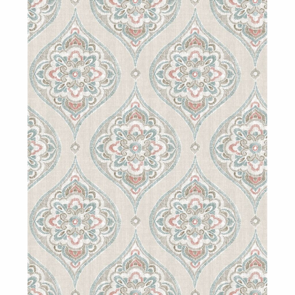 With pops of coral and teal hues, this modern damask design is ideal for adding color to rooms. Its sweet hand drawn style has a Scandinavian flair perfect for creating a whimsical space. Adele is an unpasted, non woven wallpaper.