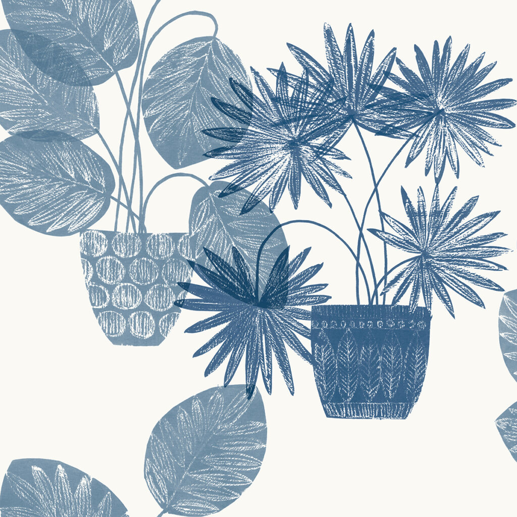This novelty botanical design is perfect for any plant-lover! The potted tropical flora is inked in shades of blue, the fronds overlapping against a soft white backdrop. Aida is an unpasted, non woven blend wallpaper.