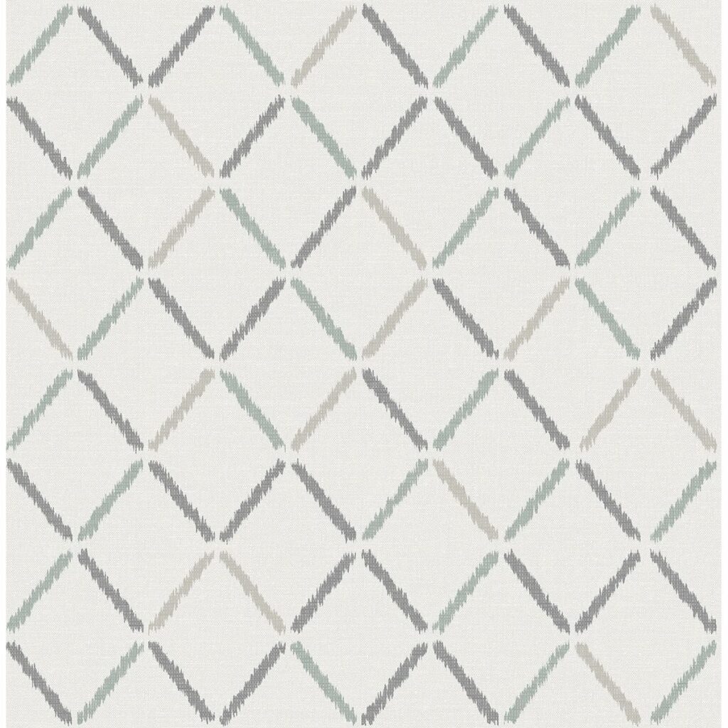 A grey, teal and beige geometric pattern flows across a white background. With raised inks, an ikat flair and a tightly woven design, this soothing linen inspired wallpaper is perfect for creating a dimensional look. Allotrope is an unpasted, non woven wallpaper.