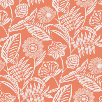Brighten your home with this tropical floral print. Stylized flowers and fronds are inked in white against a warm coral background. Alma is an unpasted, non woven blend wallpaper.