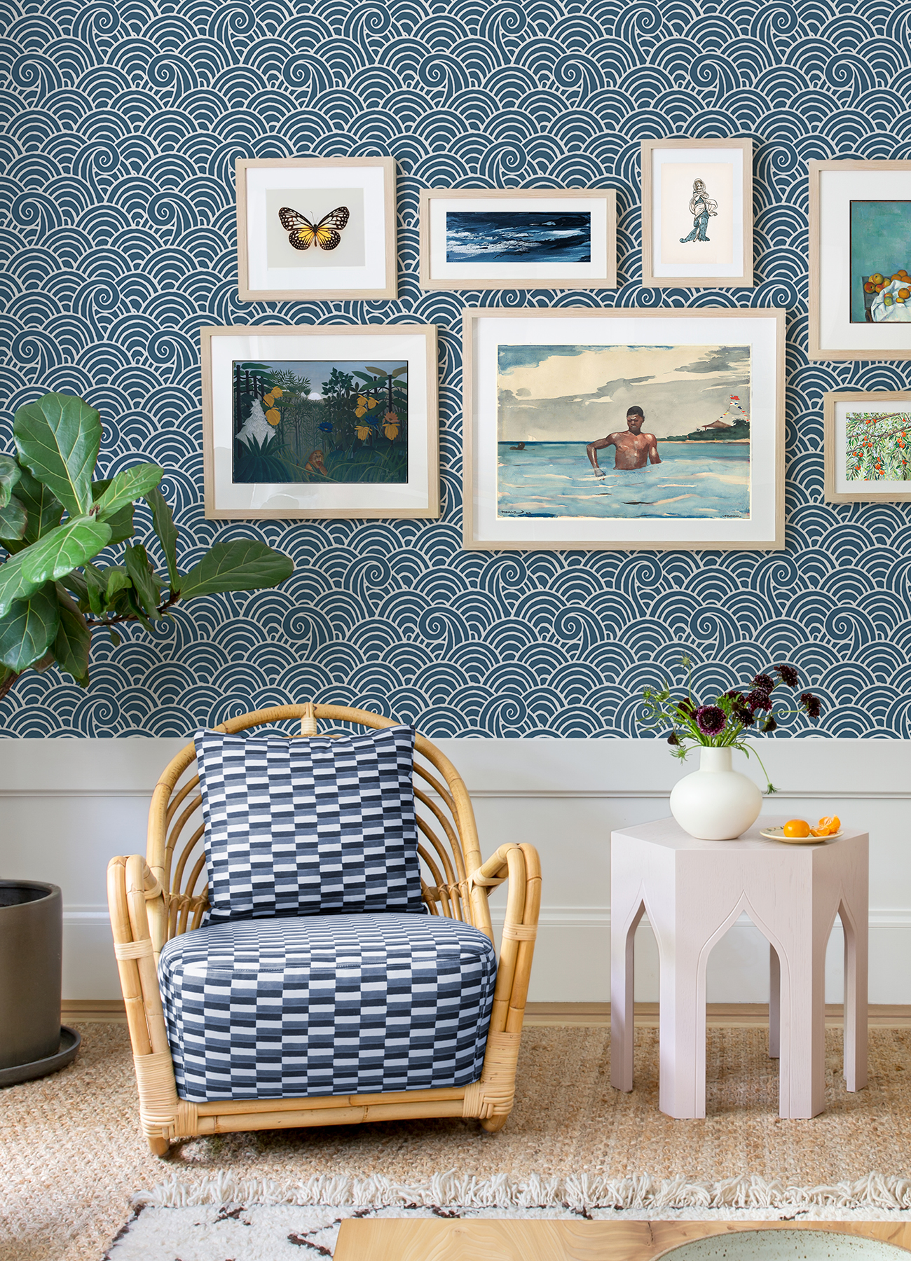 Enjoy the motion of the ocean with this playful wave wallpaper! The blue sea swells are shaped by thick white lines that emphasize the movement of this design. Alorah is an unpasted, non woven wallpaper.
