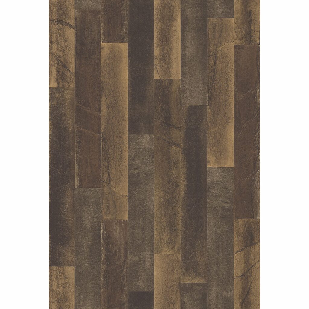 Master the repurposed trend with this wallpaper. The brown floorboard pattern has yellow and grey undertones as well as a distressed finish for an antique look. The design has a soft sheen to it to catch more light.