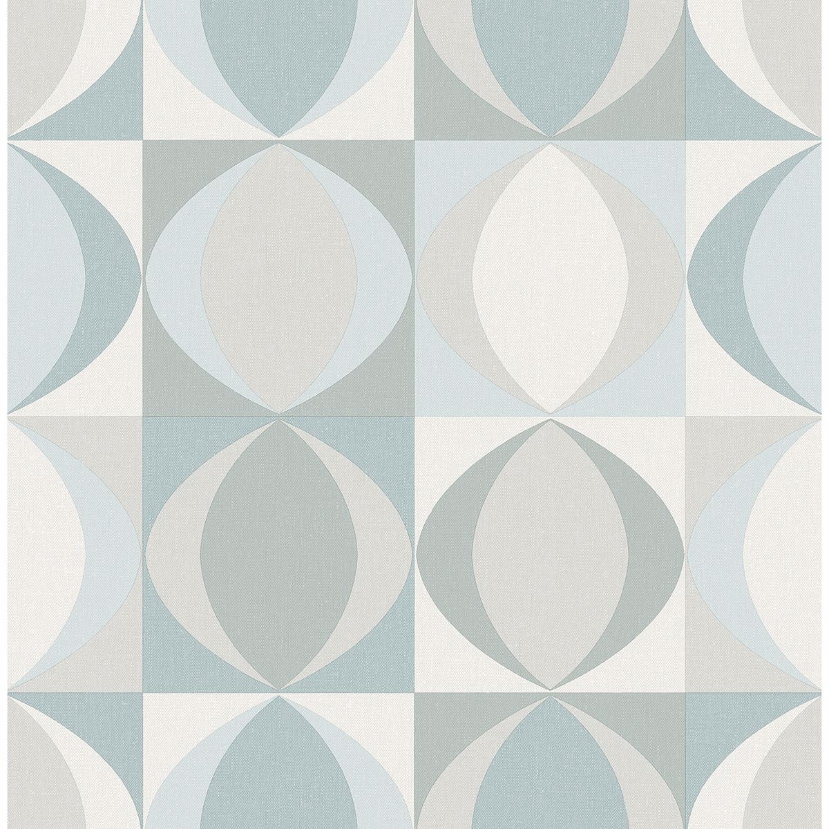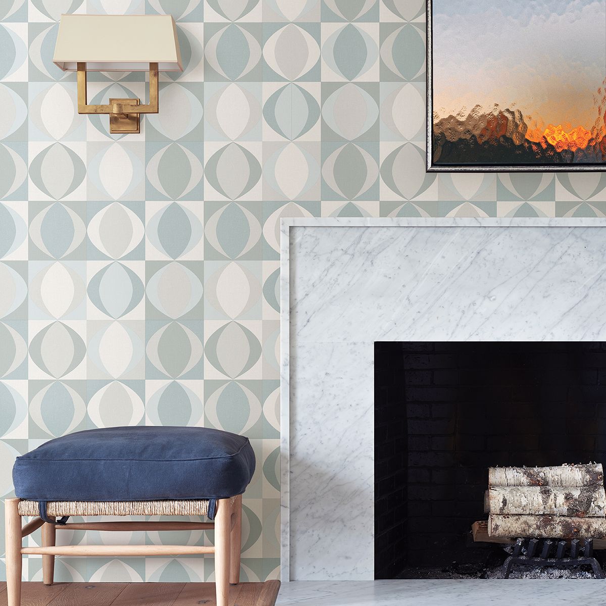 A retro inspired geometric print dazzles in this faux linen wallpaper. Icy blue hues meld with seafoam, grey and off-white colors to create its cool energy. Archer is an unpasted, non woven wallpaper.