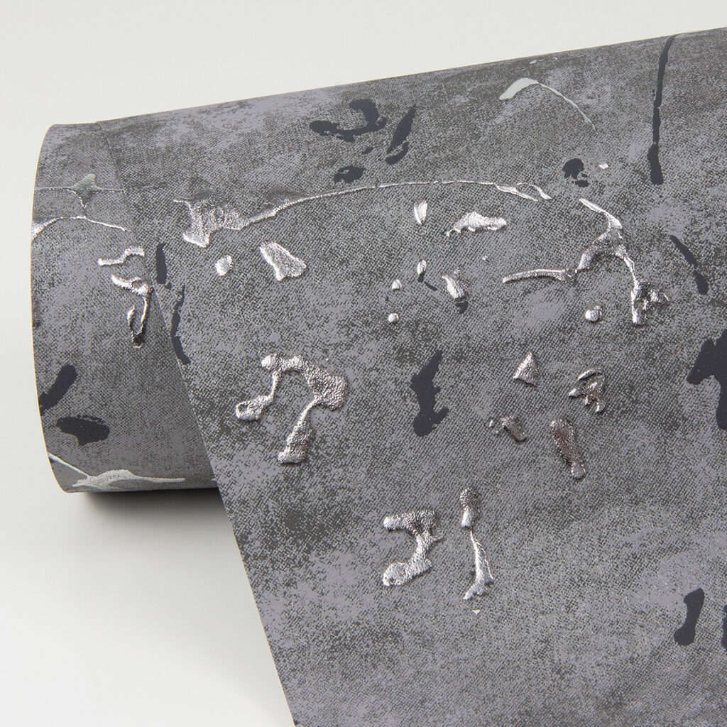 Add sophisticated flair to your home with this stunning abstract wallpaper. Shining silver and gunmetal grey inkblots with raised ink detailing delicately bloom against a variegated, stormy grey backdrop. Arian is an unpasted, foil on non woven wallpaper.