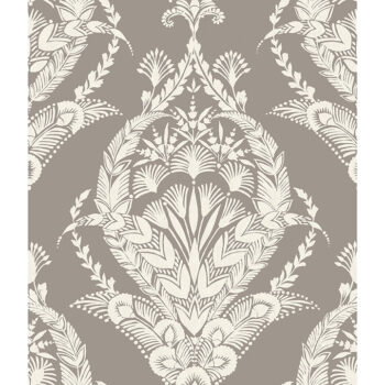 Bring a sense of grandeur to your interiors with this beautiful damask wallpaper. The flowing ogee structuring alternates between two medallion designs, both large in scale and featuring gorgeous botanical arrangements inked in distressed white and light grey inks against a cool grey backdrop. Arlie is an unpasted, non woven wallpaper.
