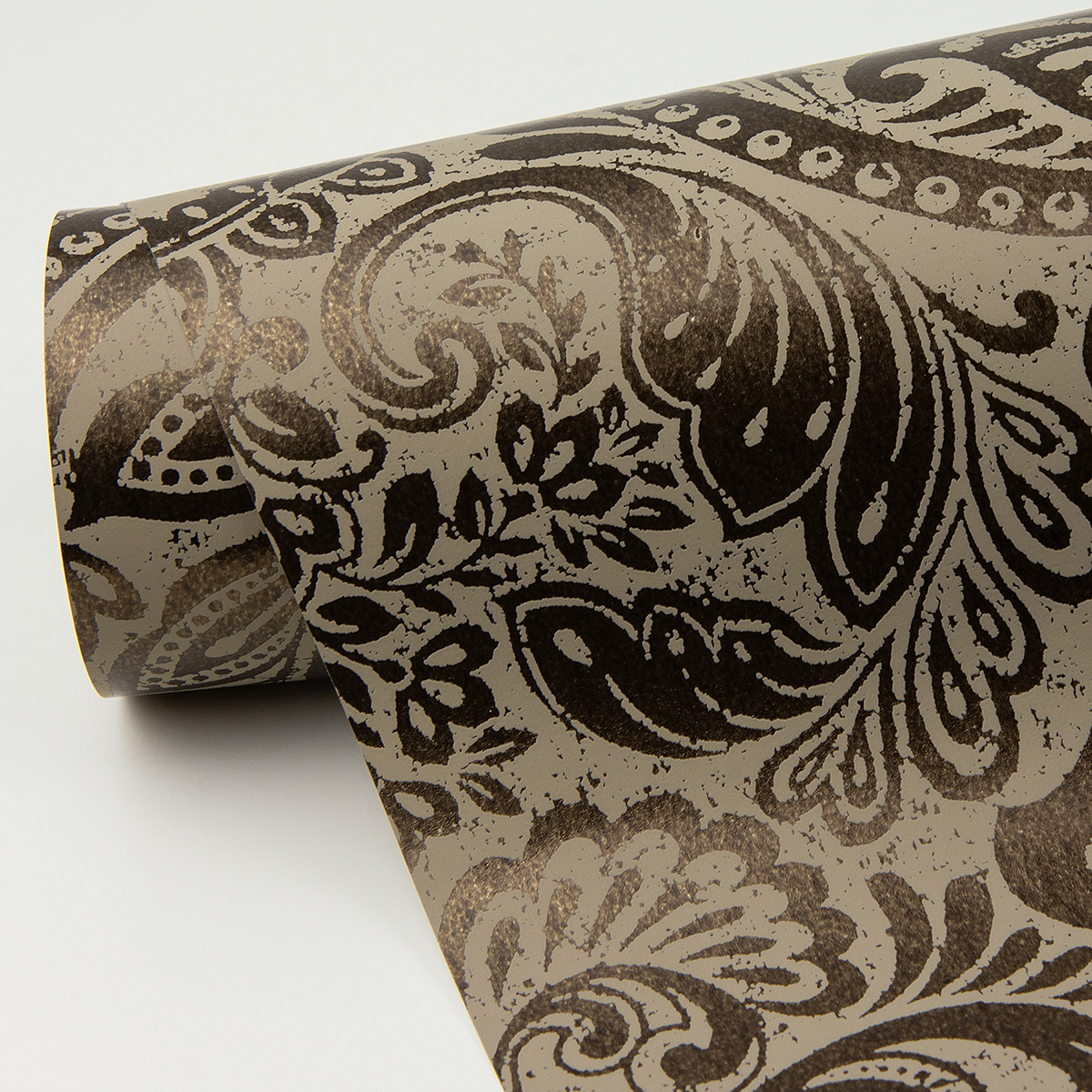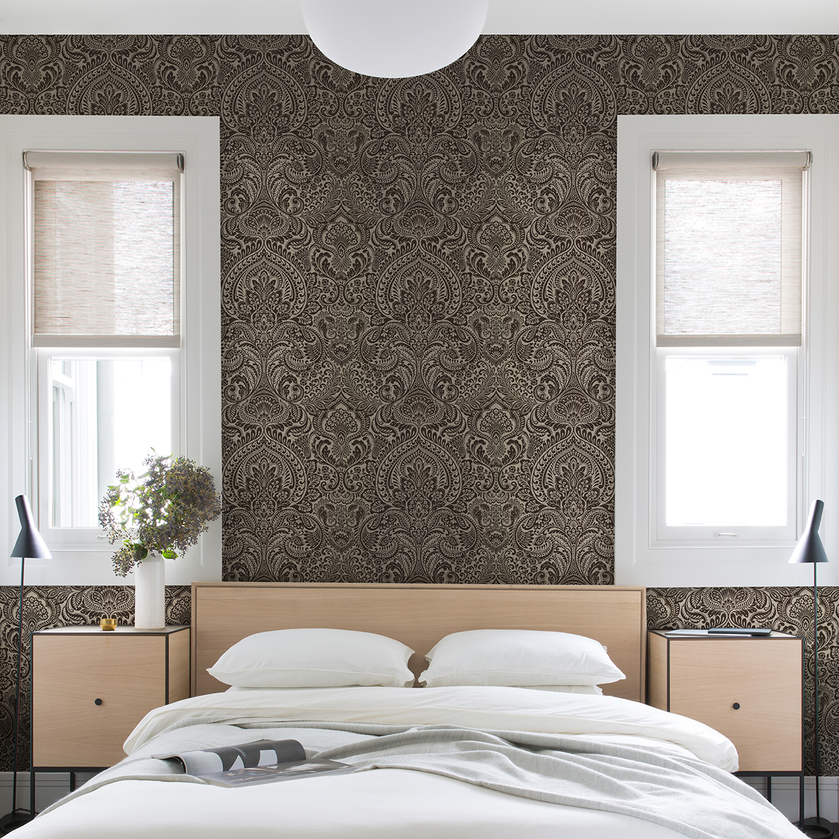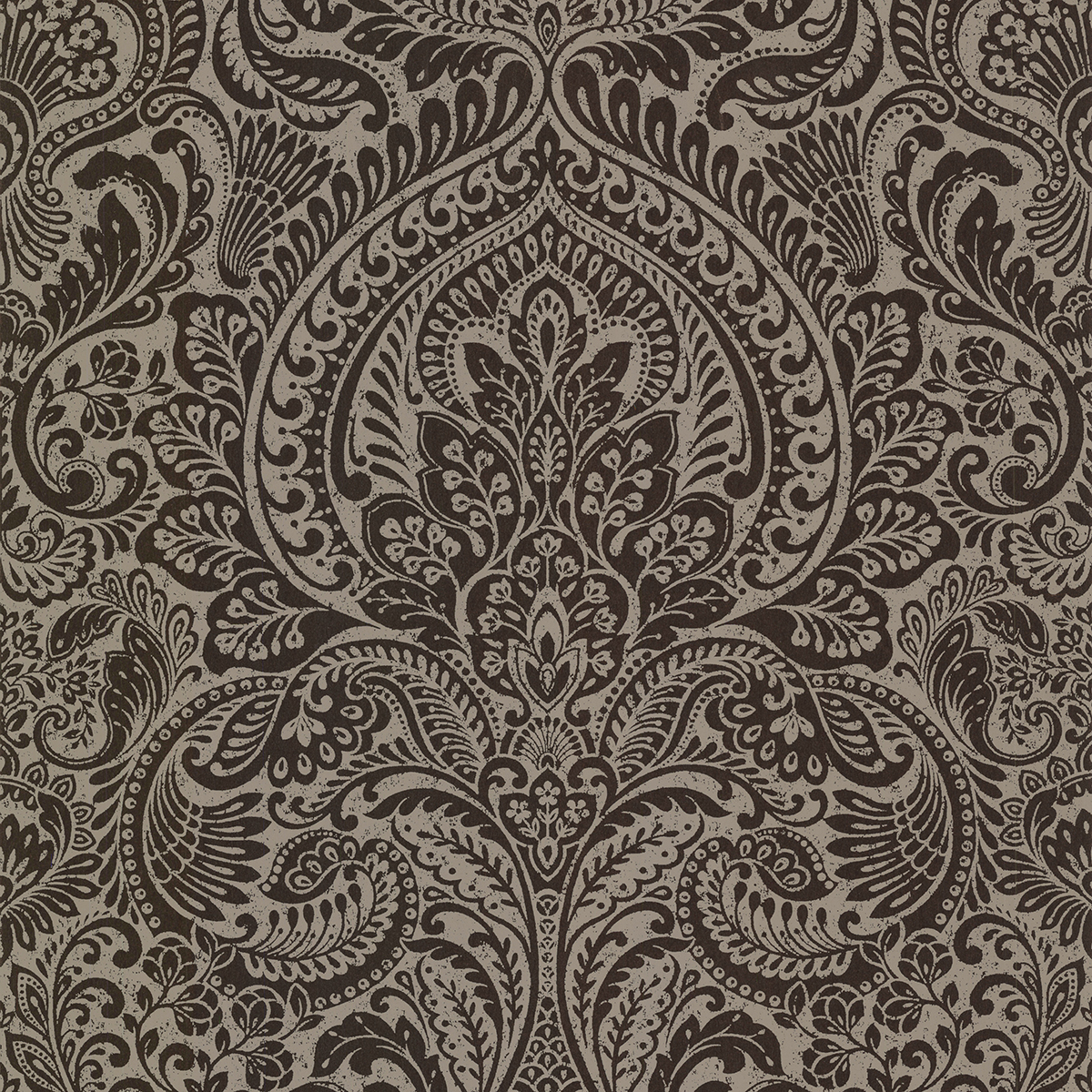 Add opulence to your home with this majestic floral damask wallpaper. The large-scale pattern boasts intricate botanical embellishments, all finished in a metallic dark brown against a delicate beige backdrop. Artemis is an unpasted, foil on non woven wallpaper.