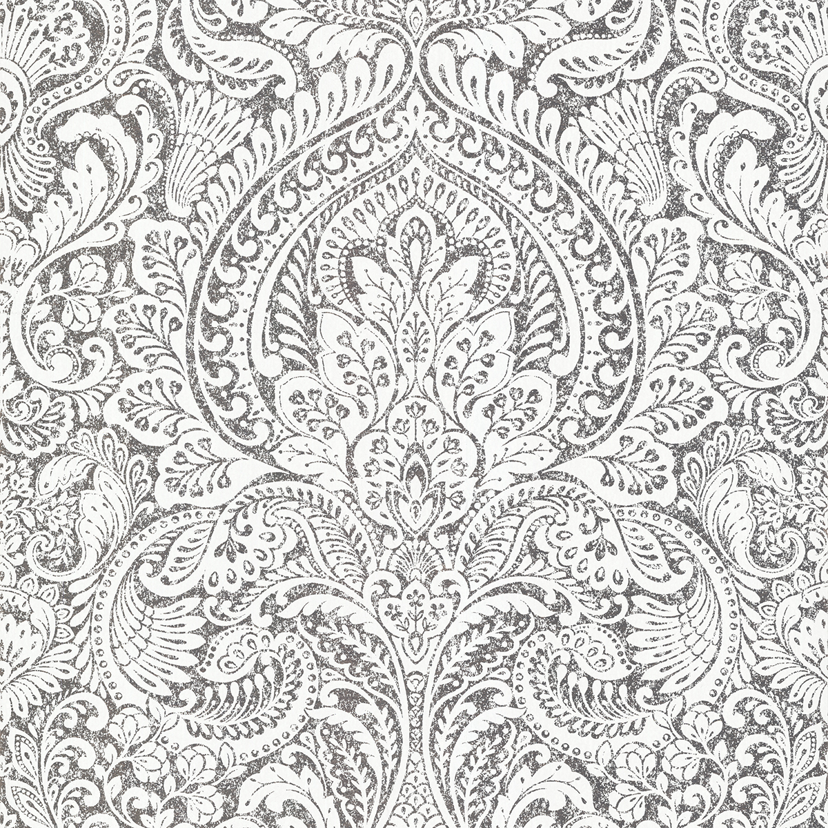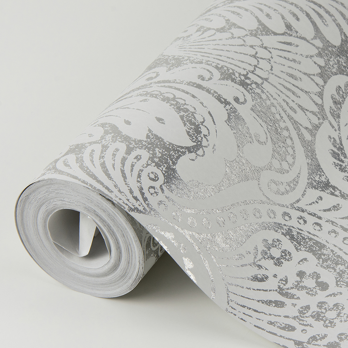 Bring regal sophistication to you walls with this majestic floral damask. The large-scale pattern is richly embellished with botanical details and inked in bright silver against a matte white backdrop. Artemis is an unpasted, foil on non woven wallpaper.