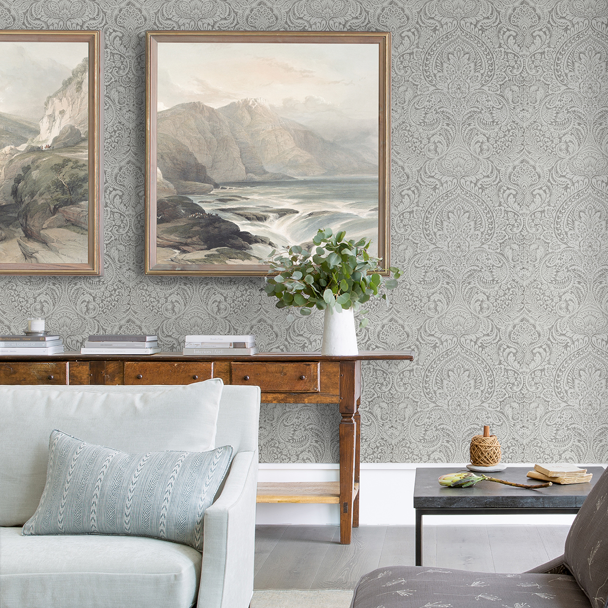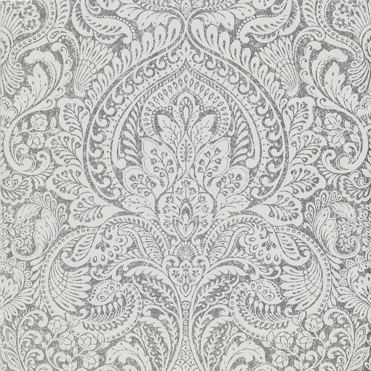 Bring majestic grandeur to your walls with this floral damask wallpaper! The large-scale design is both richly embellished and inked in a metallic, dappled silver against a pale grey backdrop. Artemis is an unpasted, foil on non woven wallpaper.
