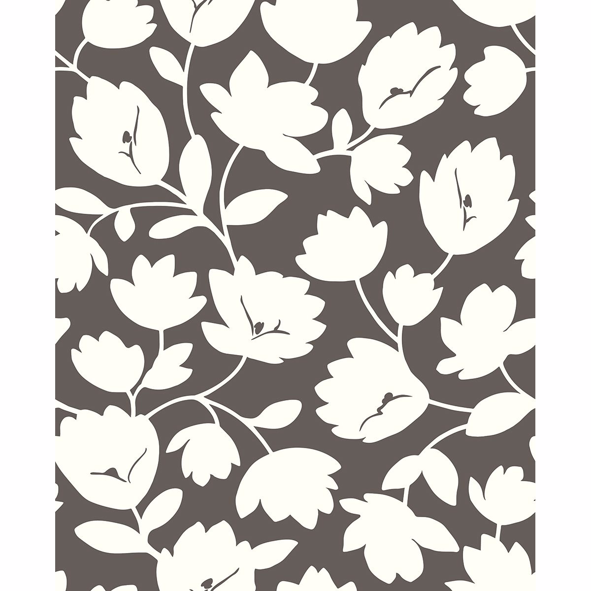 Flower silhouettes dance over a rich and welcoming shade of brown. The large-scale floral print is a warm white to complement the chocolate background. Matilda is an unpasted, non woven wallpaper.