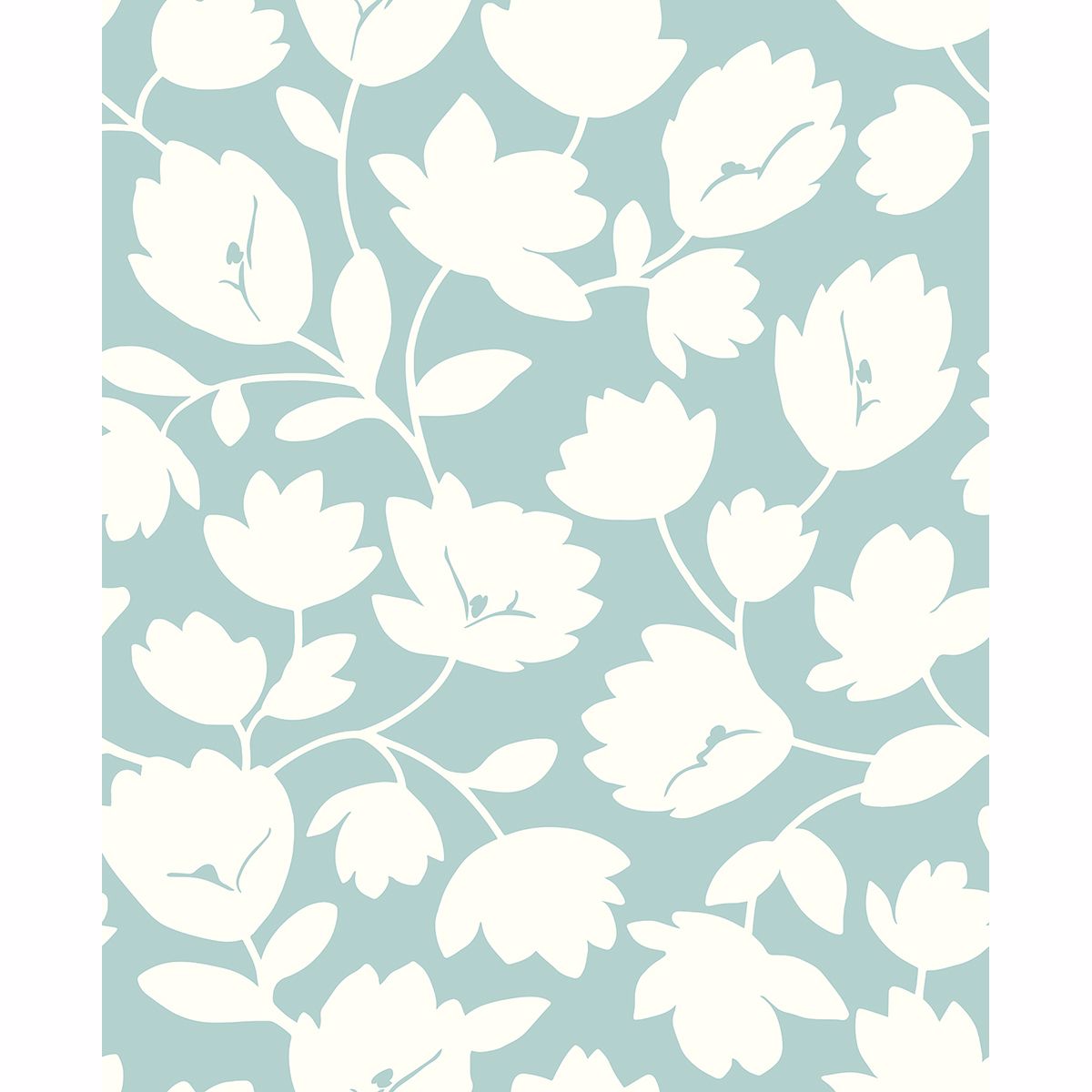 White flowers bloom against a turquoise background in this cheerful wallpaper. The large-scale silhouette design is a contemporary take on classic floral prints. Matilda is an unpasted, non woven wallpaper.