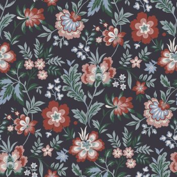 Vibrant and colorful, this modern Jacobean floral wallpaper will add life to rooms. A rich charcoal background hosts beautiful flowers with popping red, pink and blue hues. Athena is an unpasted, non woven wallpaper.
