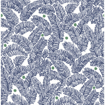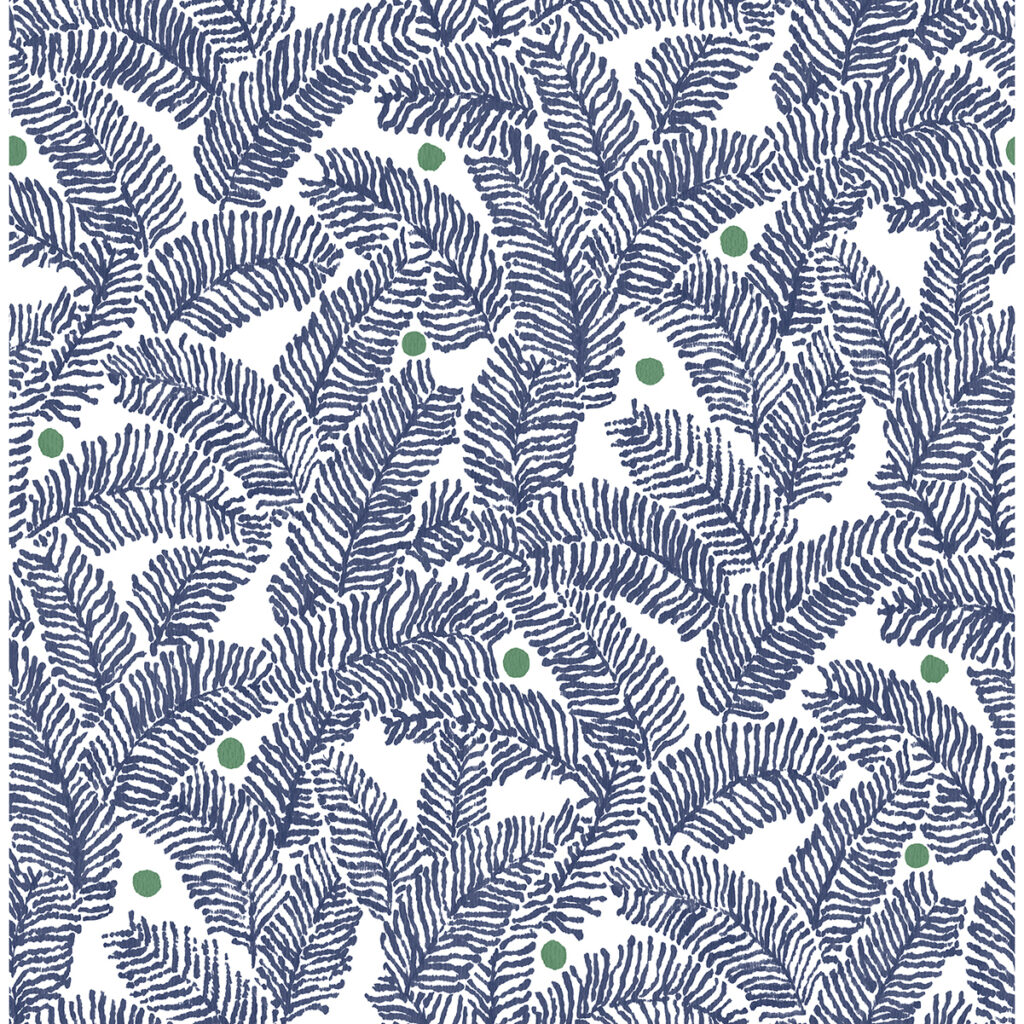 Groups of navy colored ferns sway across a white backdrop and are accented by sporadic green dots in this Scandinavian-inspired botanical. Athina is an unpasted, non woven wallpaper.