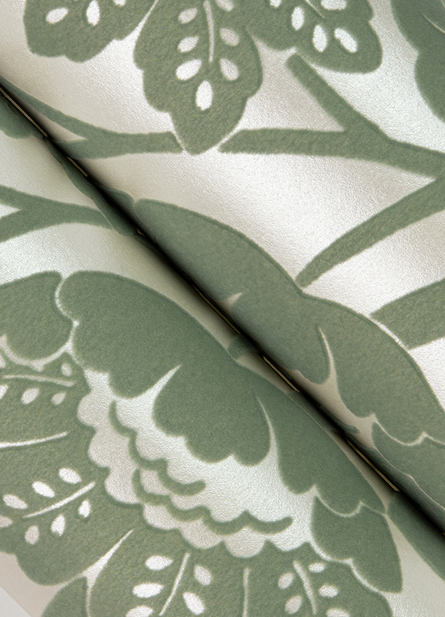 This gorgeous botanical wallpaper fuses timeless style with contemporary glamour. From its large-scale design to its luxurious interplay of velvety seafoam flock and flashy silver, every detail is opulent. Augusta is an unpasted, non woven wallpaper.