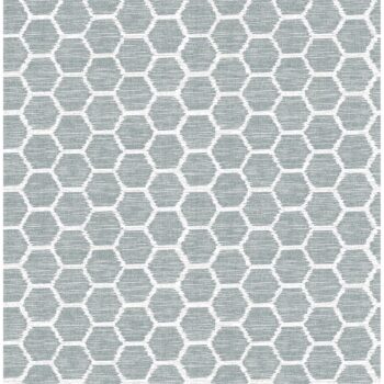 This muted teal honeycomb print has a carefree, sketched look. A texture of raised grey ink accents the contemporary wallpaper. Aura is an unpasted, non woven wallpaper.