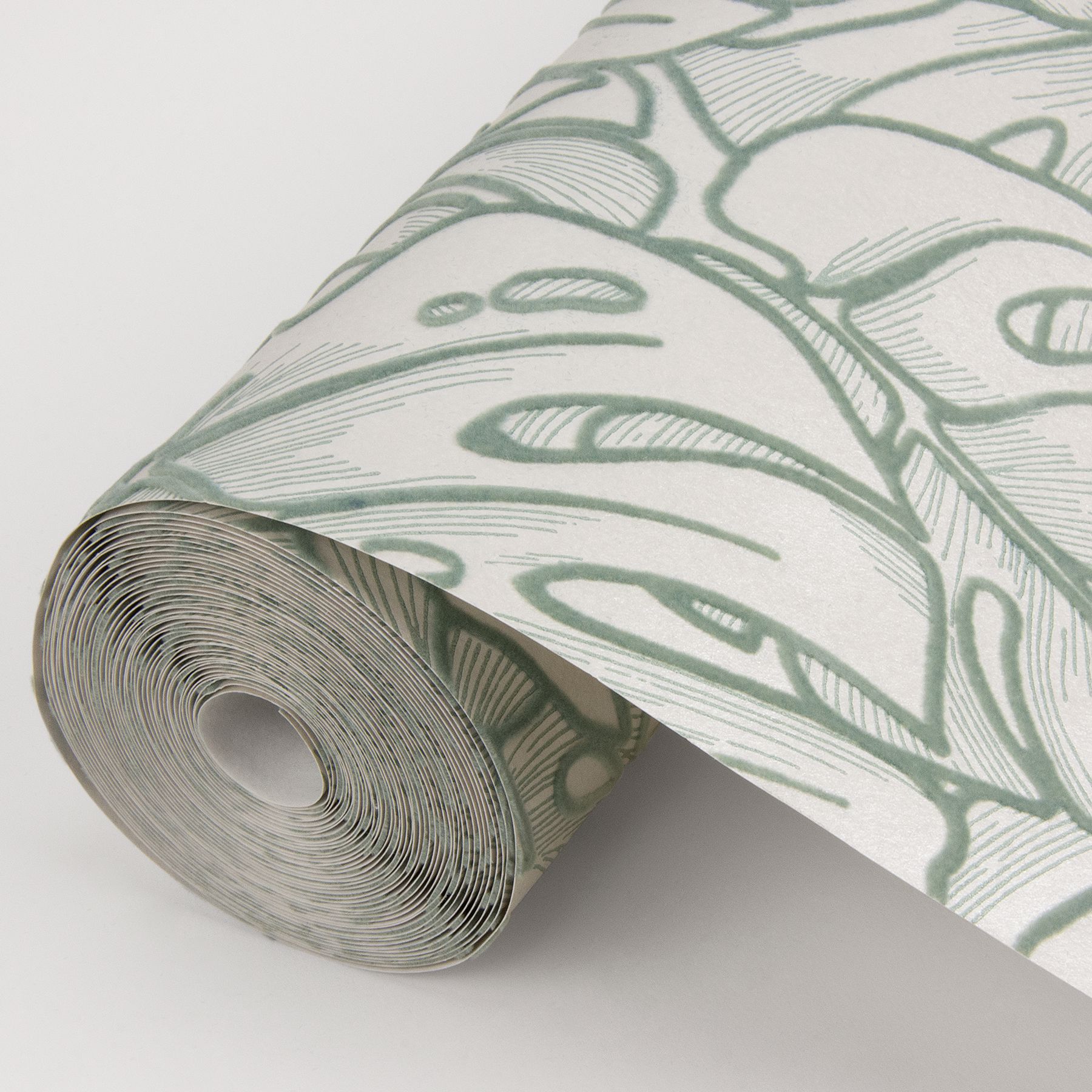 A stunning flocked leaf pattern rests atop a silver background. This wallpaper’s soft texture and olive botanical design are bold in all the right ways. Balboa is an unpasted, non-woven wallpaper.
