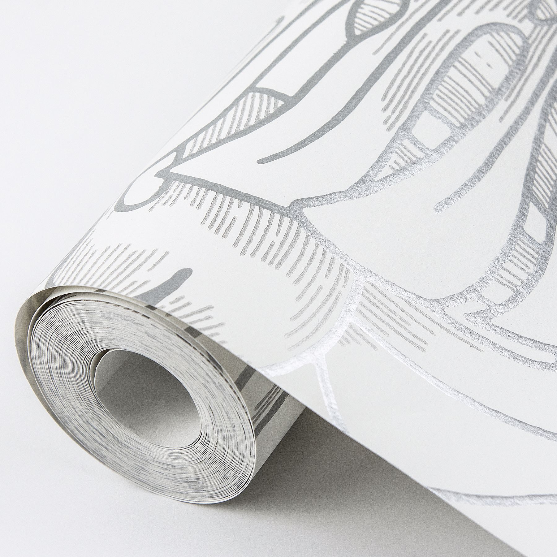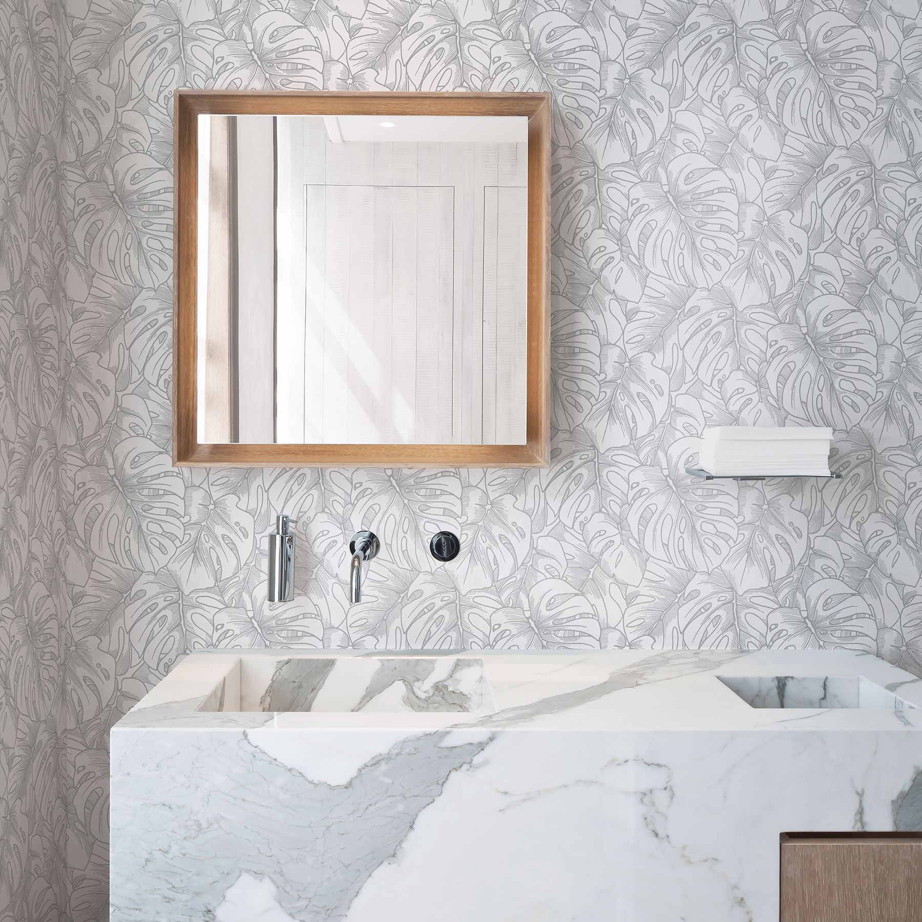 With metallic platinum shining and a crisp white backdrop, this botanical design has a fanciful feel. Large-scale leaves make up this nature-inspired design that’s perfect for any styled home. Balboa is an unpasted, non-woven wallpaper.