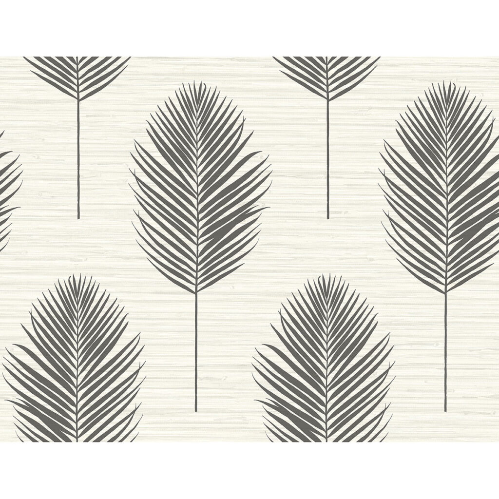 Enjoy a touch of tropical sophistication with this botanical wallpaper. Large palm fronds are inked in black against a light grey faux grasscloth backdrop. Bali is an unpasted, vinyl wallpaper.