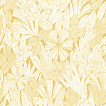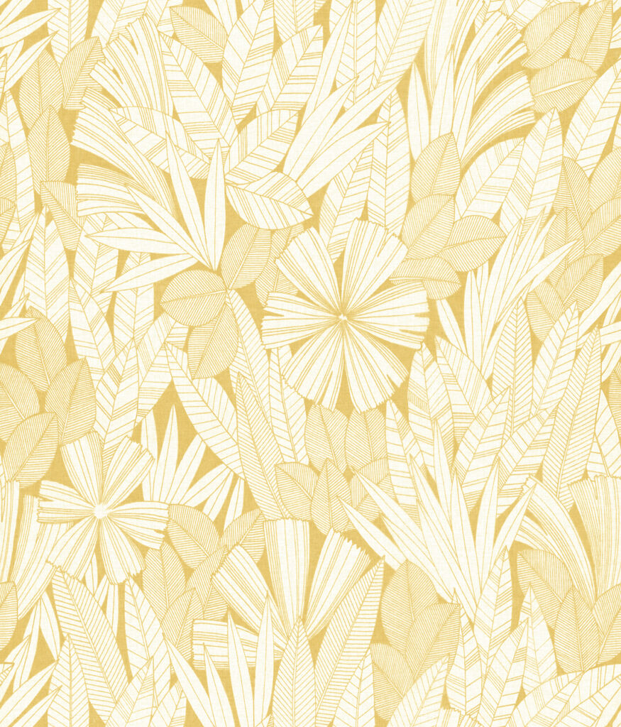 Take a stroll through a sunlit forest with this stunning botanical wallpaper. The leafy plants are simply and crisply illustrated in buttery yellow against a dove white faux linen backdrop. Bannon is an unpasted, non woven wallpaper.