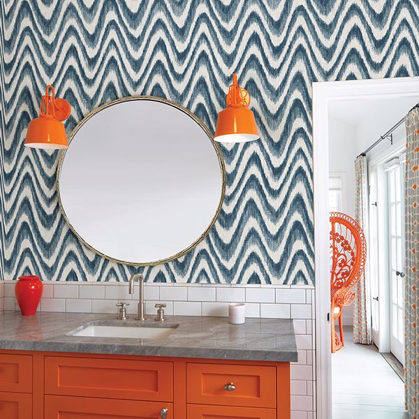 This grasscloth inspired wallpaper features a soothing blue wave pattern. Its gorgeous design is accented by an ikat flair and raised inks. Bargello is an unpasted, non woven wallpaper.