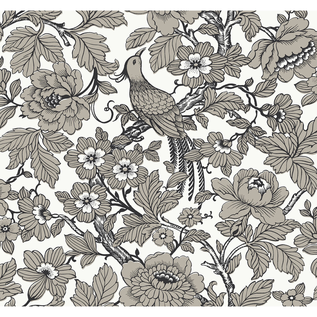 This stunning chinoiserie wallpaper is traditional elegance with a modern touch. A bird perches among the limbs of a flowering tree, simply illustrated with strong black lines and shaded with taupe against a creamy white backdrop. Beaufort is an unpasted, screen acrylic coated wallpaper.