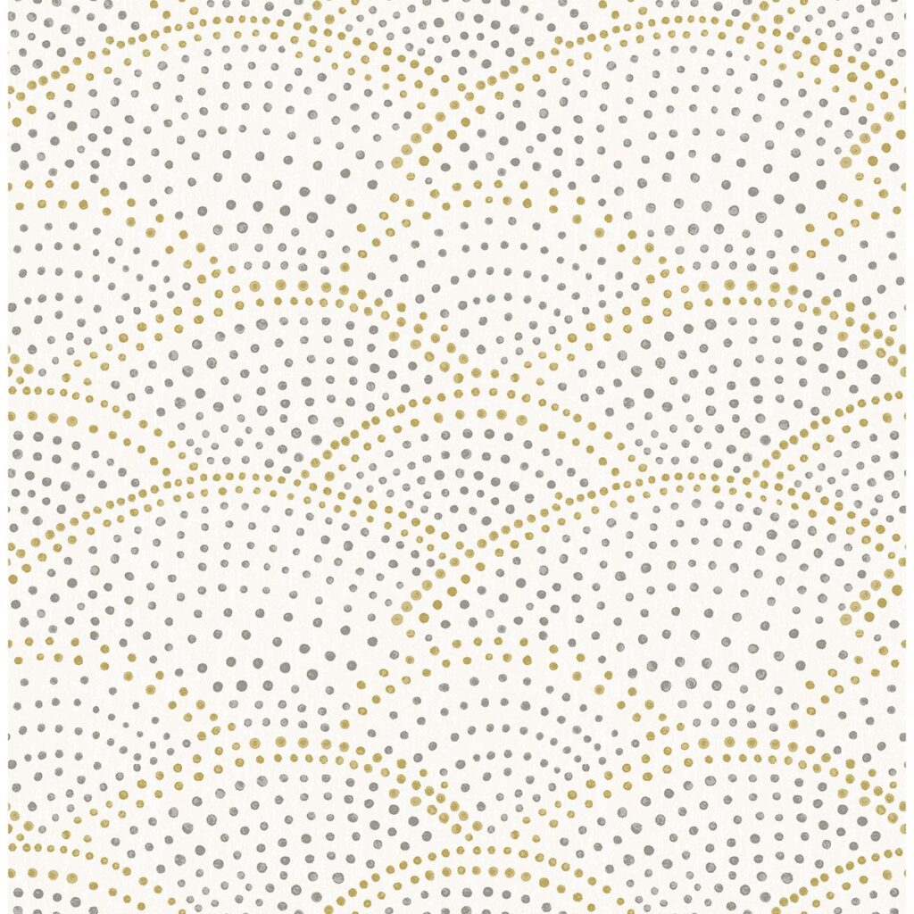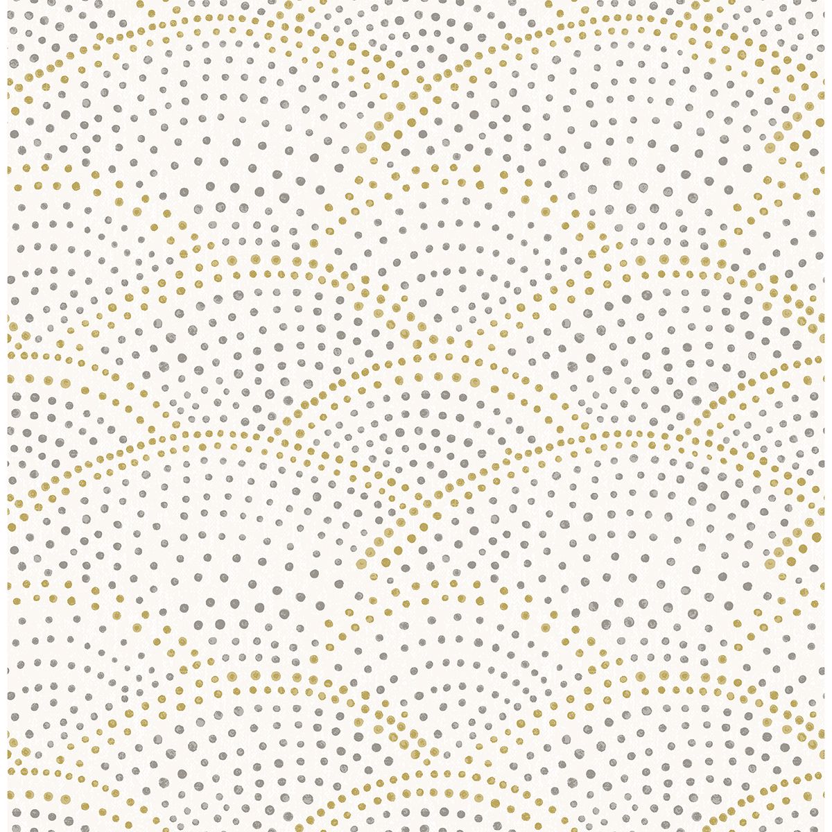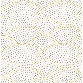 Effortlessly charming, this scallop wallpaper has an eclectic chic style. Miniature grey and mustard dots dazzle against an off-white background, while raised inks create a dimensional effect. Bennett is an unpasted, non woven wallpaper.
