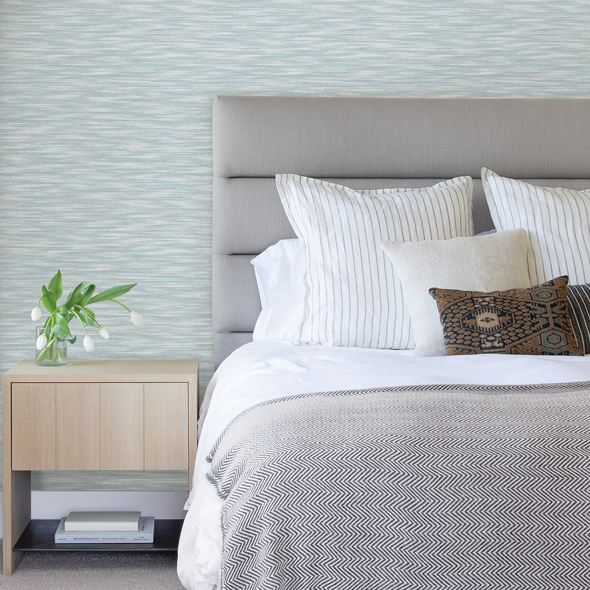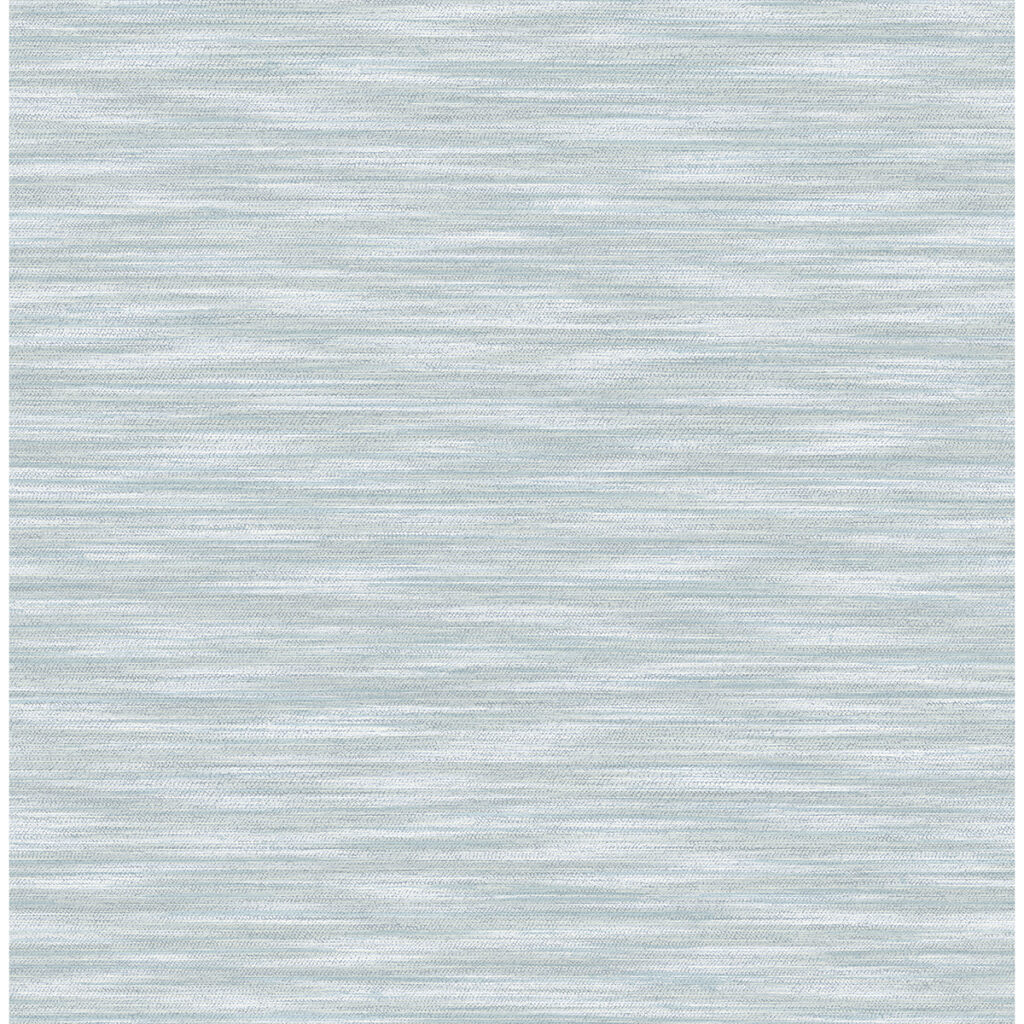 Add soft dimension to your space with this textural faux fabric design. A blend of light blues are woven together to create a variegated striped surface with subtle woven accents. Benson is an unpasted, non woven wallpaper.