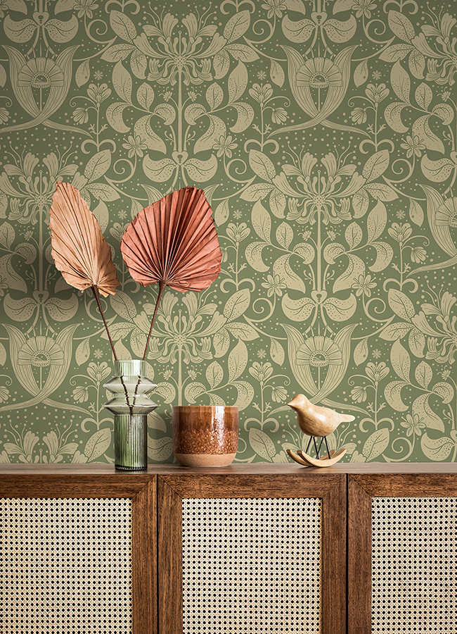 Bring stately, Art Nouveau sophistication to your walls with this botanical wallpaper. An exotic flower takes center stage, the details of this damask inked in sandy beige against a rich green backdrop. Berit is an unpasted, non woven wallpaper.