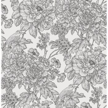With the look of a hand drawn print, this botanical design has a lovely vintage style. Its black pattern features an array of blossoming flowers and shy songbirds. Birds of Paradise Breeze is an unpasted, non woven wallpaper.