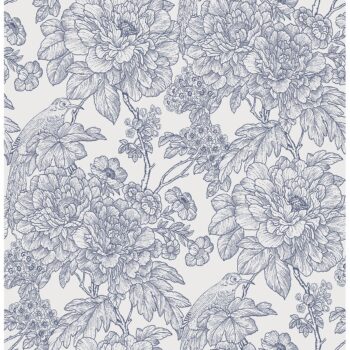 With the look of a hand drawn design, this nature inspired print has a subtle vintage style. Beautiful blue flowers blossom against a crisp white background, while shy birds perch on curling vines. Birds of Paradise Breeze is an unpasted, non woven wallpaper.