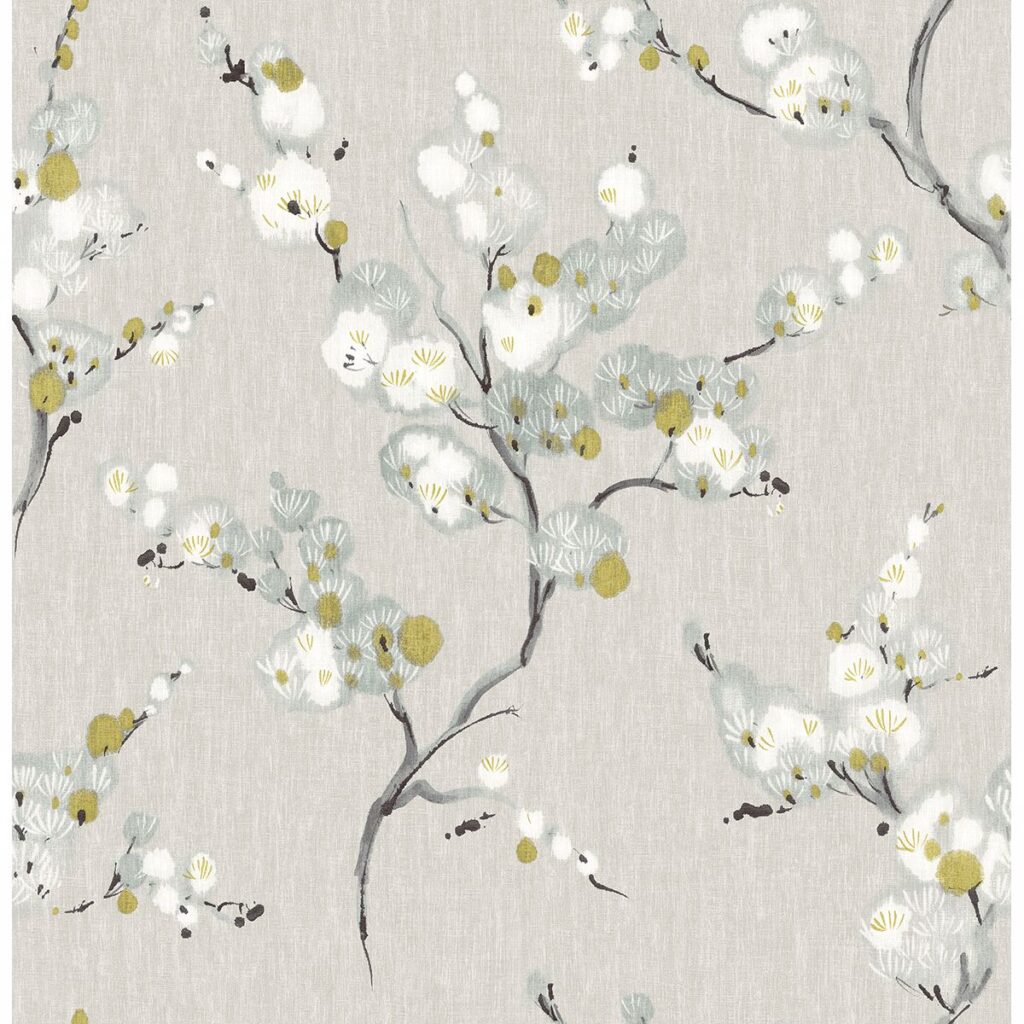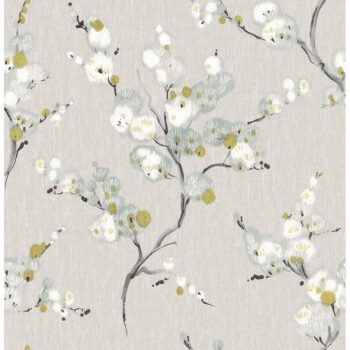 Influenced by Japanese art, this hand-painted pattern harkens to another era while remaining distinctly modern. The blue, yellow, and white blossoms decorate a cool grey linen print. Bliss is a unpasted, non woven wallpaper.