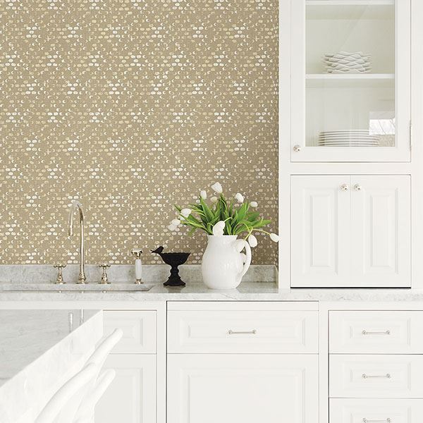 Over a base of dark wheat with golden warmth, a harlequin pattern is camouflaged within an abstract design. A raised ink effect gives the light yellow and white dots a hand-painted look. Blissful is an unpasted, non woven wallpaper.