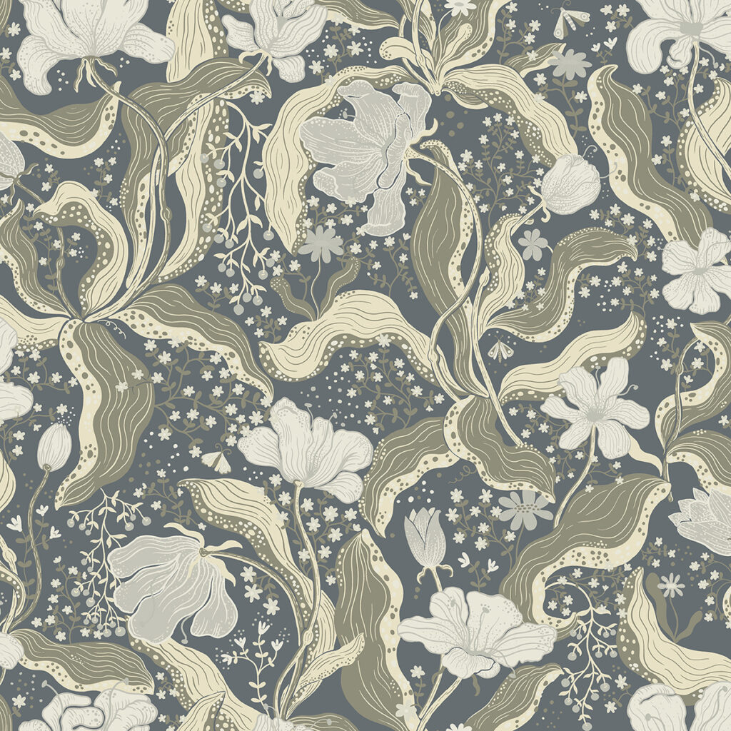 Bring moody sophistication to your interiors with this Arts & Crafts-inspired floral wallpaper. The dusty blue blooms sit atop sage green stems, the rich blue backdrop doted with petite white flowers and fluttering moths. Bodri is an unpasted, non woven wallpaper.