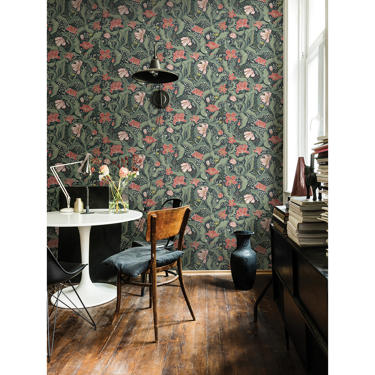 Create a moody and stunning summer garden with this floral wallpaper. This Arts & Crafts-inspired design features pink and red tulips on lush, curving stems surrounded by petite wildflowers, berries and moths – all set against a deep turquoise. Bodri is an unpasted, non woven wallpaper.