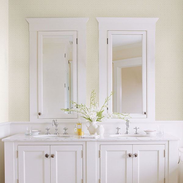 A pearlescent sheen and raised ink help separate the boxy geometric pattern from its background. The platinum and white color scheme makes for an icy and chic look. Boxwood is an unpasted, non woven wallpaper.
