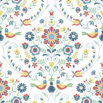 Enjoy the homespun comfort of this eclectic and elegant damask wallpaper. The charming design features a central bouquet framed by curling vines and sweet songbirds, the details seemingly embroidered in an array of blue, green, yellow, and red threads. Britt is an unpasted, non woven wallpaper.