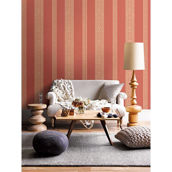 Color walls in a pretty coral hue with this stylish wallpaper design. Alternating stripes of varied widths create a mesmerizing scene that features gorgeous medallions encased in an ornate paisley print.