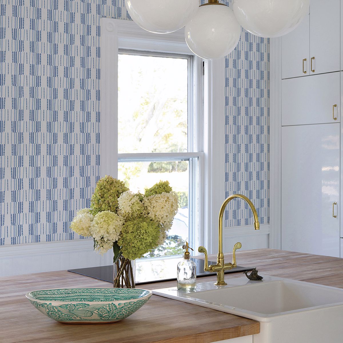Teal, navy and blue geometrics pop against a crisp white background in this fabric inspired print. Raised inks will add dimension to walls. Burgen is an unpasted, non woven wallpaper.
