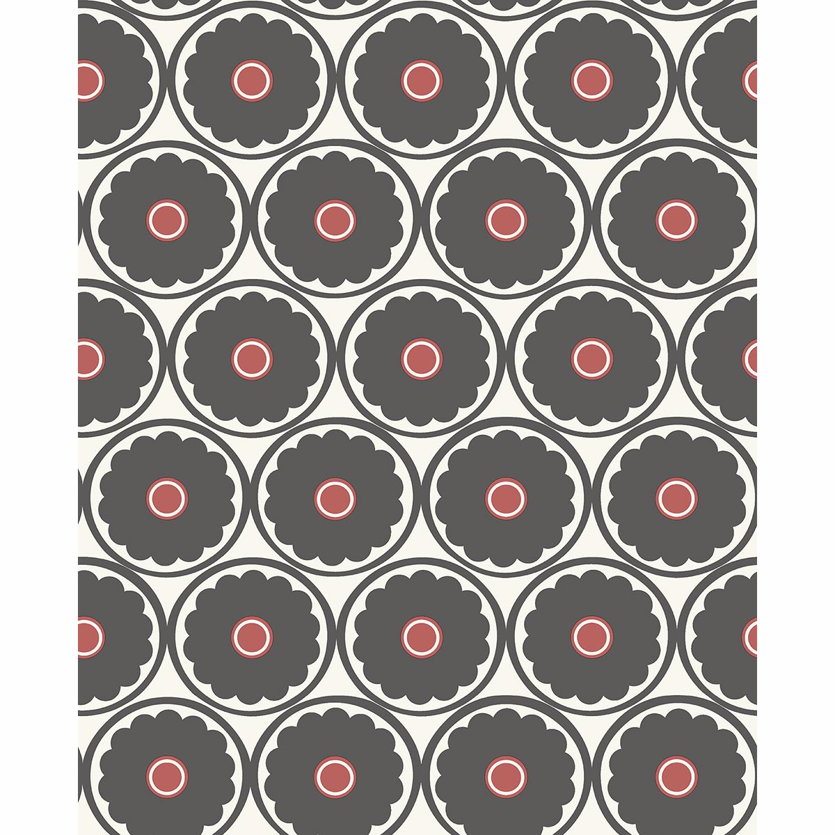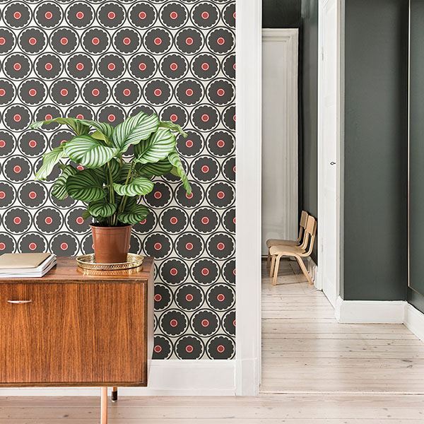 There’s nothing delicate about this floral wallpaper. Bold and crisp, the circled red and black blooms create a mesmerizing pattern. Buttercup is an unpasted, non woven wallpaper.