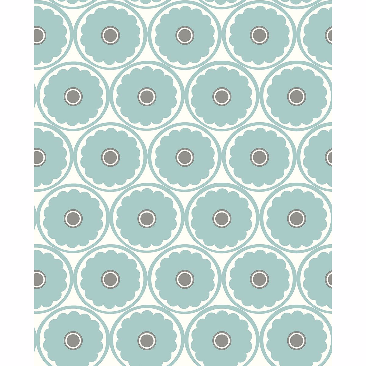 Add a punch of happiness to a room with this wallpaper. Grey centers accent the turquoise flowers and fresh white background. Buttercup is an unpasted, non woven wallpaper.