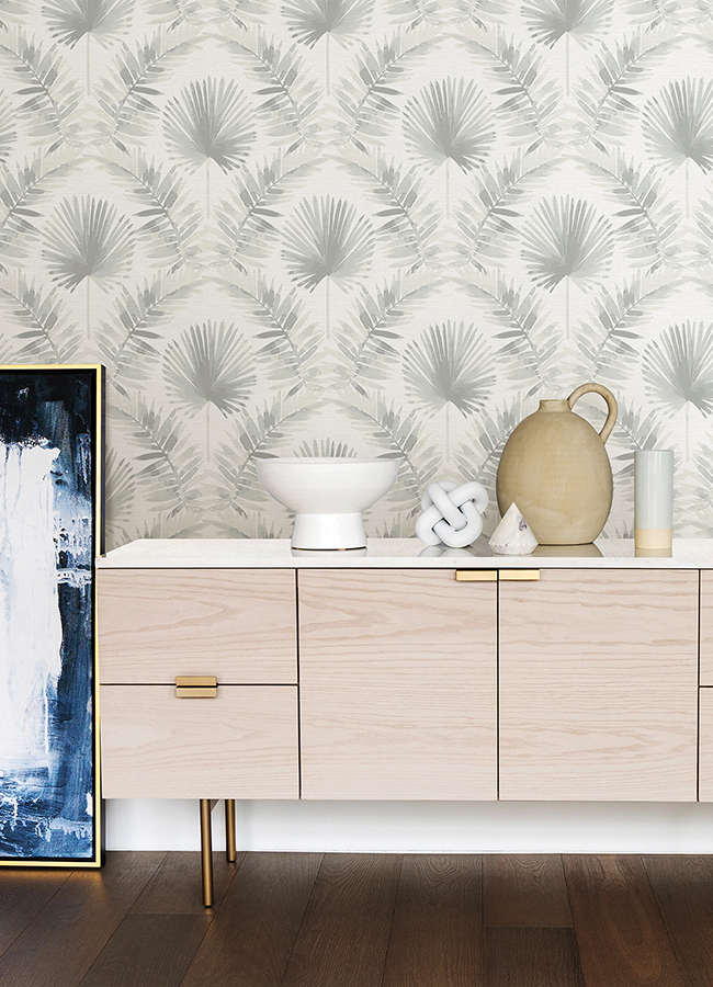 Invite tropical tranquility to your interiors with this soothing damask design. A fan palm is framed by curving fronds, all painted in soft shades of grey against an off-white, woven backdrop. Calla is an unpasted, non woven wallpaper.
