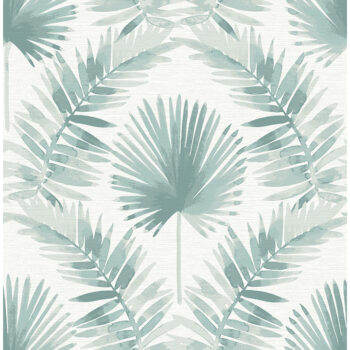 Infused with artistic flair, this stunning tropical wallpaper brings serenity to your home. A fan palm is framed by curling fronds, all painted in shades of teal and light blue along a cream backdrop imbued with woven detailing. Calla is an unpasted, non woven wallpaper.