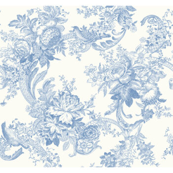 Add old world charm to your home with this impressive floral wallpaper. A medley of flowers and leaves wrap around architectural scrolls where a dove perches, all finely detailed in blue ink against a white background. Carmel is an unpasted, gravure acrylic coated wallpaper.