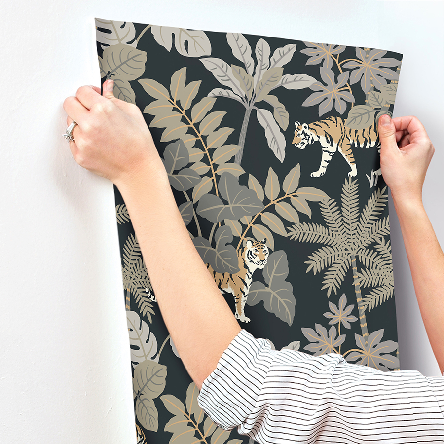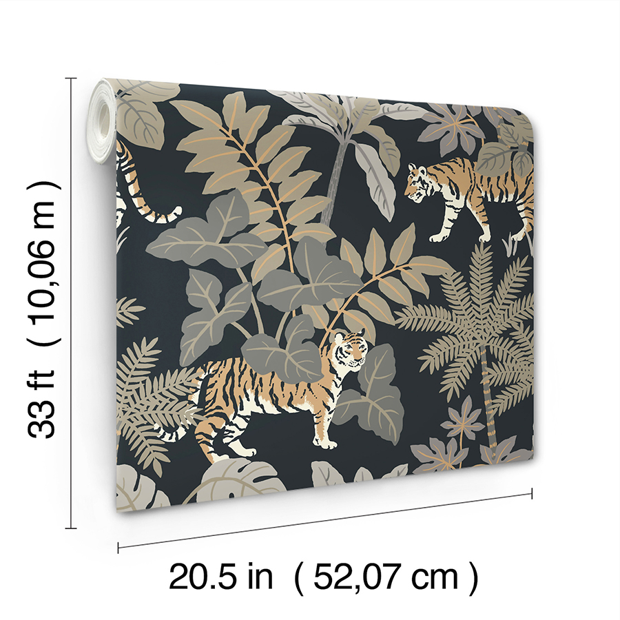 This captivating jungle wallpaper takes cat walk to a whole new level. Muted, orange-brown tigers prowl through lush rainforest flora inked in cool greens and greys subtly accented by metallic gold, all offset against a charcoal grey backdrop. Caspian is an unpasted, non woven wallpaper measuring 20.5 inches wide by 33 feet long, covering approximately 56.4 square feet per roll.