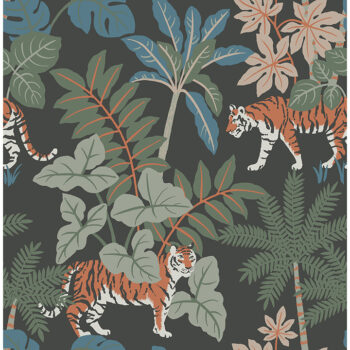 This captivating jungle wallpaper takes cat walk to a whole new level. Red-orange tigers prowl through lush rainforest flora inked in bright blues, earthy greens, taupe, and coral, all offset against a rich grey backdrop. Caspian is an unpasted, non woven wallpaper measuring 20.5 inches wide by 33 feet long, covering approximately 56.4 square feet per roll.