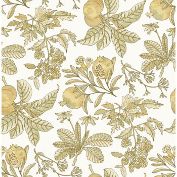 Bring warmth and classic charm to your interiors with this fruit wallpaper! Leafy boughs sport pomegranates, blackberries, and wildflowers in turn, the warm amber and olive-green hues soft against a bright white backdrop. Cecilia is an unpasted, non woven wallpaper.