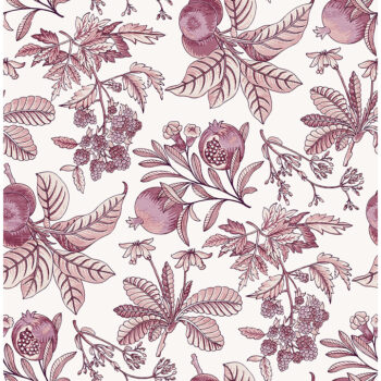 Add color and charm to your walls with this timeless fruit design. Pomegranates and blackberries still ripe on the vine are artistically rendered in shades of purple and taupe, various wildflowers filling out the rest of the space along a bright white backdrop. Cecilia is an unpasted, non woven wallpaper.