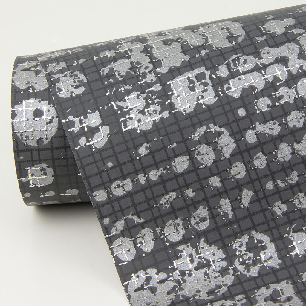 Add dimension and drama to your walls with this contemporary geometric design. The dark grey backdrop is overlaid with a fine grid of metallic silver and variegated grey circles. Celeste is an unpasted, foil on non woven wallpaper.