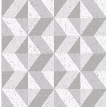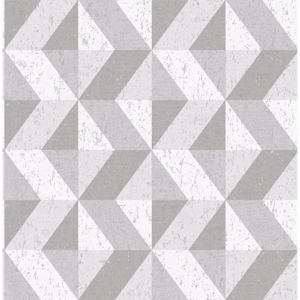 With a shimmering silver and grey geometric design, this faux concrete wallpaper has a contemporary flair. Distressed accents and textural elements lend to its stone inspired look. Cerium is an unpasted, non woven wallpaper.